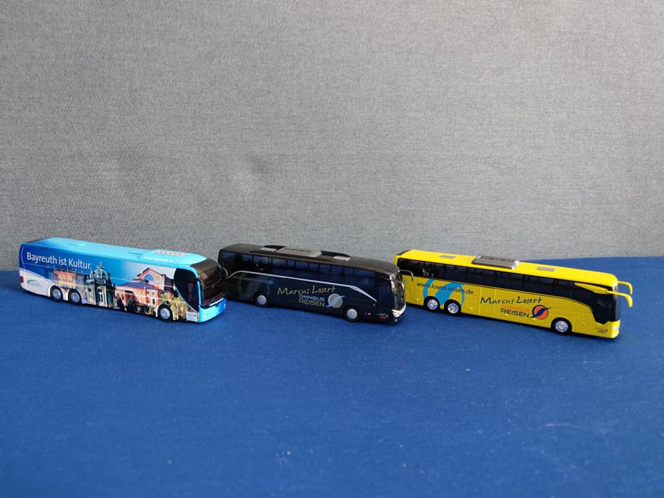 Unser ehemaliger MAN Lion's Coach mit der Werbung von Bayreuth, Unser schwarzer Reisebus von Setra S 515HD und brandneu unser Jupitergelber Reisebus ein Mercedes Benz Tourismo L.